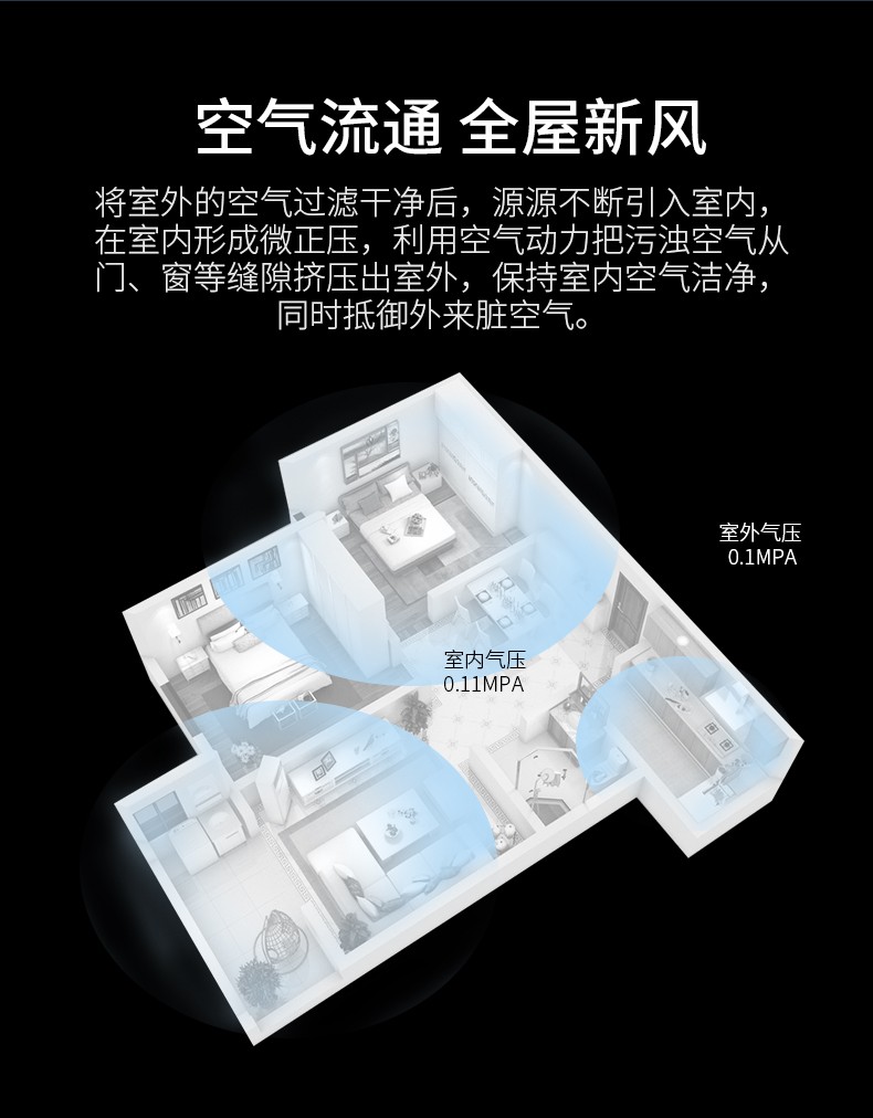 1.全直流变频无刷电机,三档调速 </br> 2.滤网更换提醒功能 </br> 3.工作原理:上出风